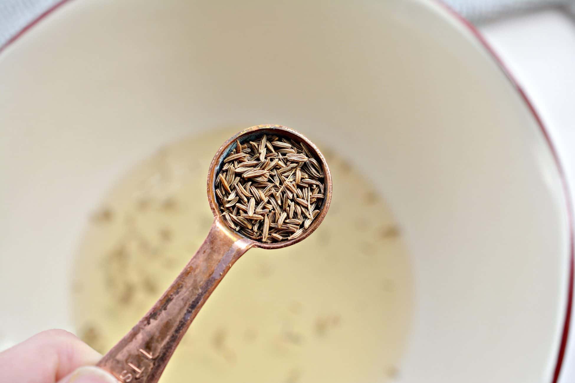 Step 3. In a bowl, combine the broth, caraway seeds, and bay leaf.
