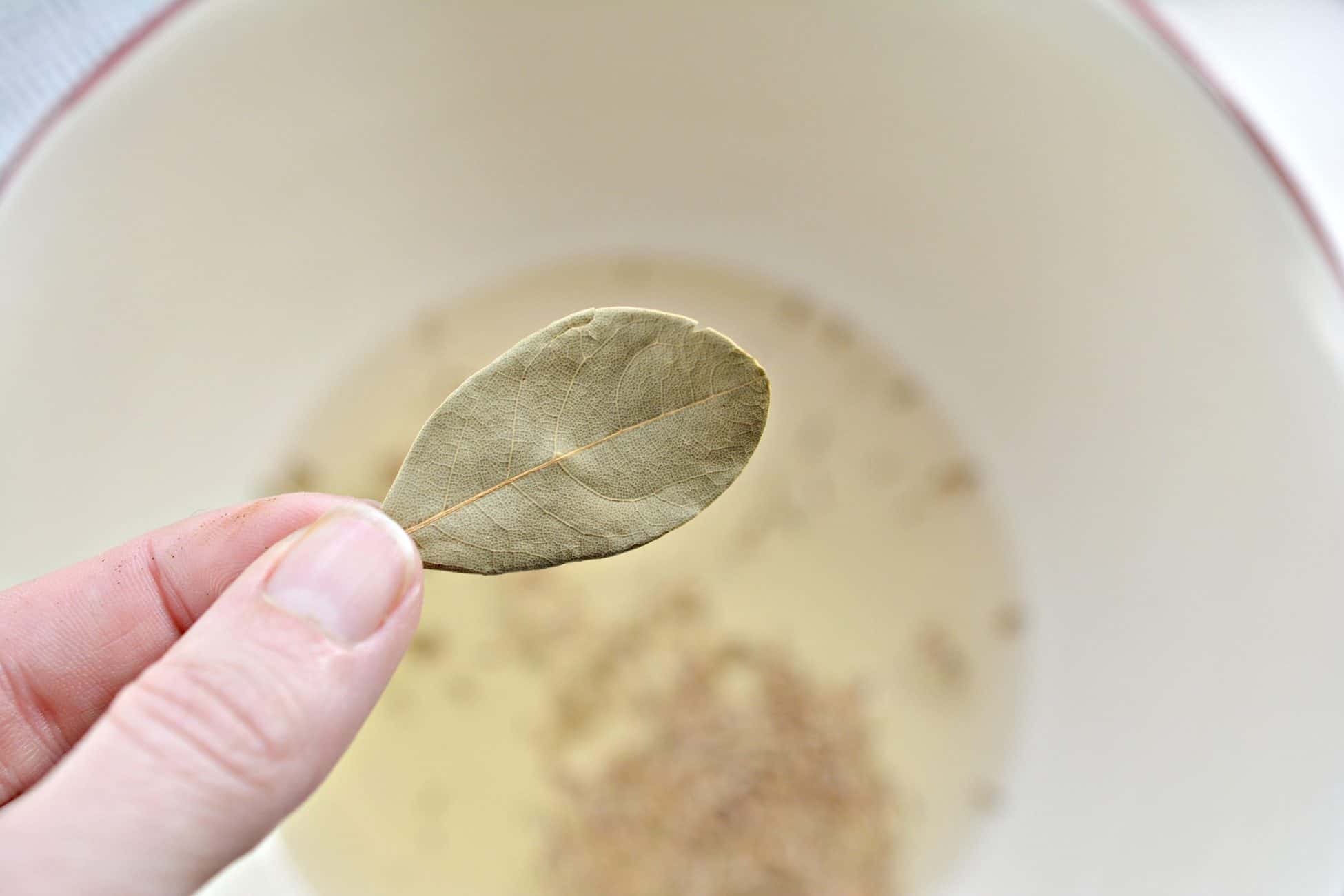 - In a bowl, combine the broth, caraway seeds, and bay leaf.